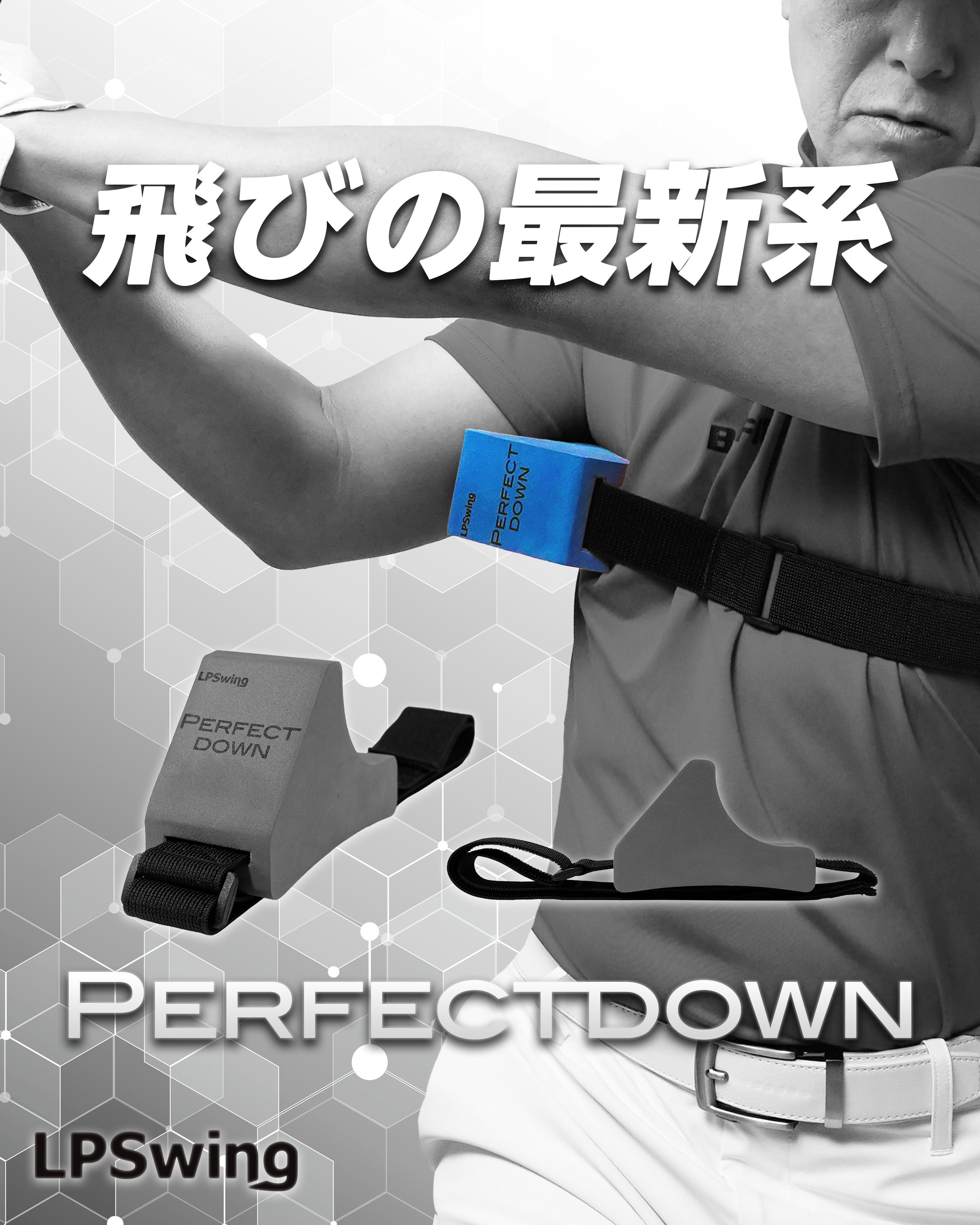 パーフェクトダウンとは、トップからダウンスイングに入る瞬間に右腕を正しく使うことで、クラブをインサイドから下ろし、フォロースイングで左肘の抜け(チキンウイング)を防ぐための理想的なダウンスイングが習得出来るトレーニング器具です。両腕と体の連動を整えることで、再現性の高いインパクトと大きく伸びたフォロースルーが実現します。