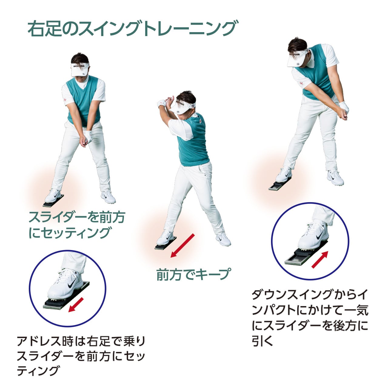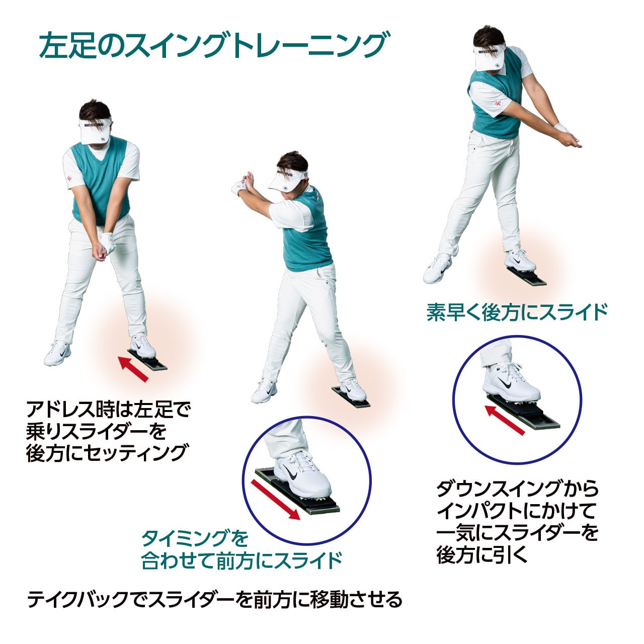 パワースライダーは飛距離アップに必要な下半身の動きと、瞬発的にパワーを発揮させるトレーニング器具です。左足セッティングの場合は、HIGHマークが外側に来るように設置し、スライダーをかかと側にセッティングします。テイクバックのタイミングでスライダーを前方に移動させ、ダウンスイングからインパクトにかけて素早く後方に引くことで、ロングインパクトゾーンと、ヘッドスピードアップされたスイングが習得できます。右足セッティングの場合は、HIGHマークを外側に設置し、つま先に圧をかけながらテイクバックをし、切り返しからダウンスイングに入るタイミングで、右足を引きながらインパクトをすることにより、体の開きを防止し、ふところの広いロングインパクトゾーンが習得できます。